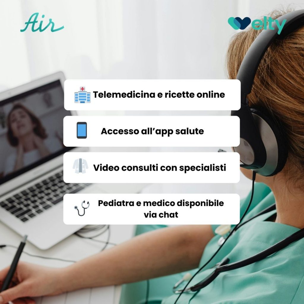 Air ha scelto di offrire ai propri clienti il piano Elty Family, pensato per mettere la salute della famiglia al centro. Un servizio sempre disponibile direttamente in app, con medici e specialisti a portata di click.